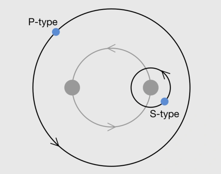 Если же планета обращается вокруг всей системы сразу, говорят, что она на P-орбите. Таких систем известно всего несколько десятков, но, возможно, лишь потому, что подобные планеты труднее обнаруживать: они слишком далеки от своих звезд.