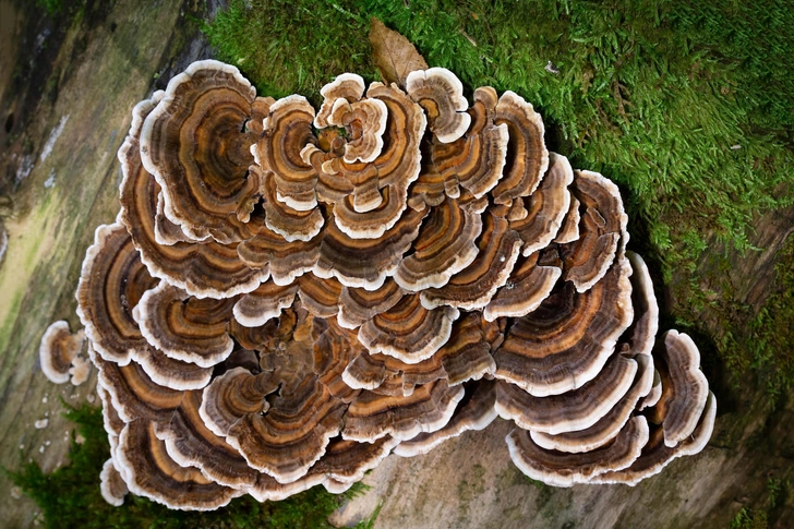 Очень распространенный трутовик с многоцветными «веерами» плодовых тел, напоминающими хвост индейки. В Китае и Японии отвар T. versicolor использовали для поддержания жизненной силы и иммунитета, а сейчас траметес — один из наиболее изученных грибов в контексте онкологии и иммунологии.