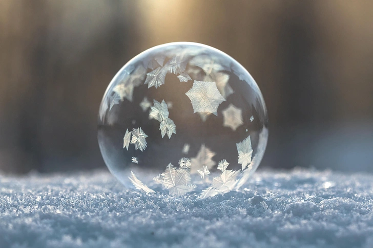 Слово «вечность», которое Кай выкладывал в палатах Снежной королевы, — пожалуй, самое уместное для букв изо льда. Для воздушных, быстро исчезающих мыльных пузырей лучше подходит «мгновение». Но зима позволяет соединить эти противоположности, получив изящные и хрупкие кристаллические сферы. В морозный день осторожно усадите мыльный пузырь на заснеженную поверхность, и он быстро зарастет крошечными ледышками — мимолетными, как дыхание, и холодными, как вечность.
