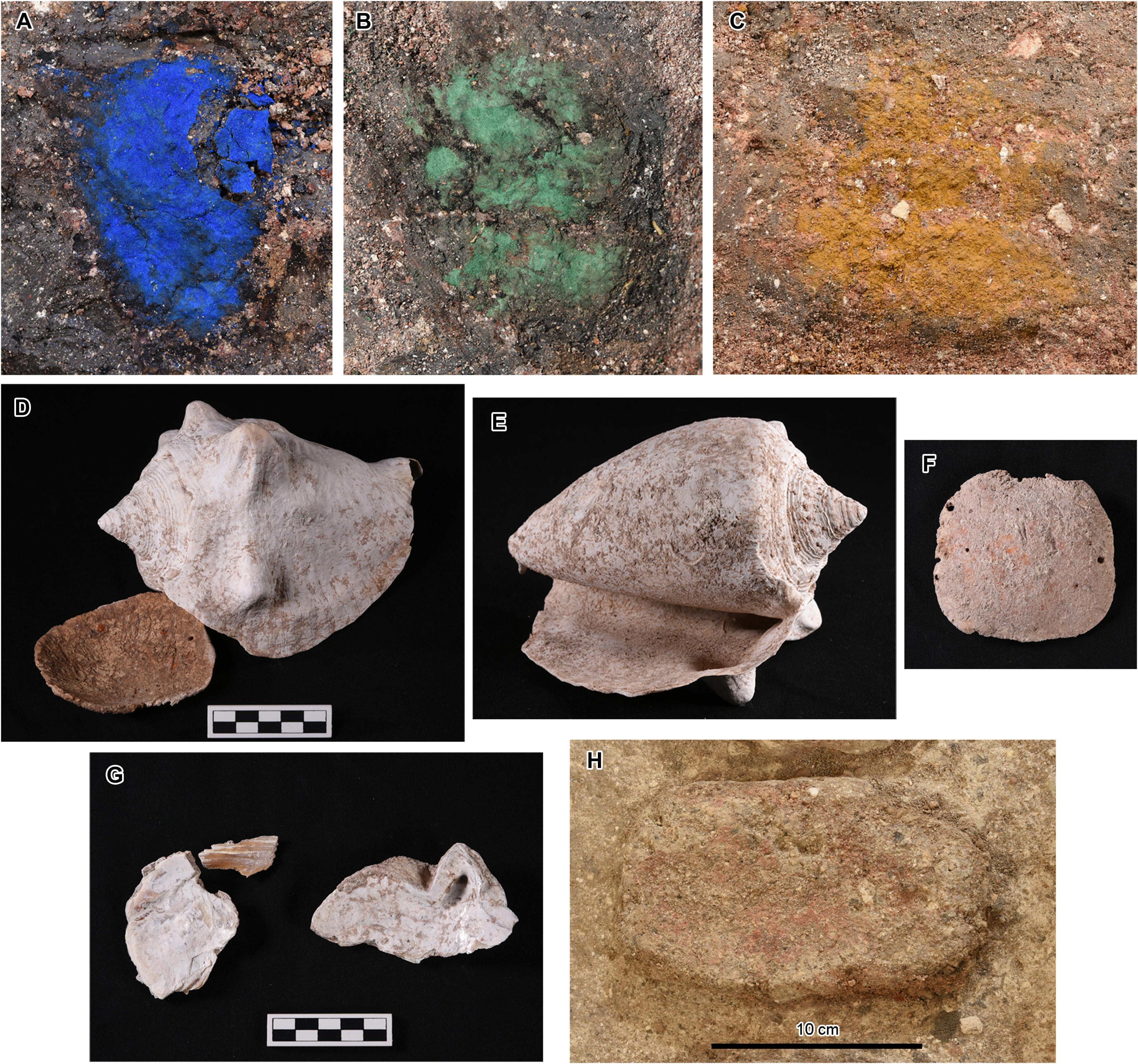 Кроме пигментов, археологи обнаружили на месте и другие артефакты — много нефритовых фигурок животных и изваяние, изображающее женщину в момент родов (ниже на фото под буквой D). Чтобы выяснить, что все это означает, арехологи продолжат раскопки.