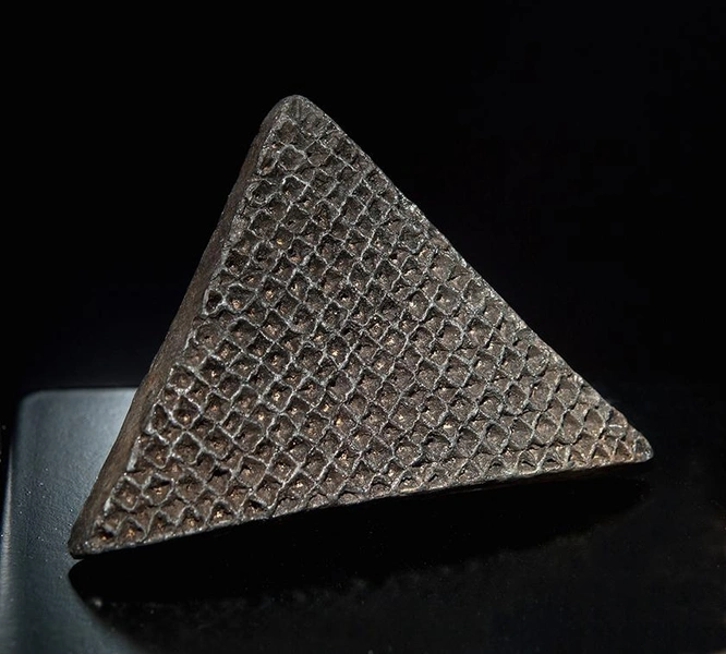 Высота артефакта составляет всего 4,3 сантиметра. Он представляет собой неправильную глиняную пирамиду с вогнутыми сторонами и сломанной ручкой. Его основание — размером 4,2 на 3,7 сантиметра — украшено геометрическим узором, состоящим из выгравированных линий, треугольных и круглых углублений.