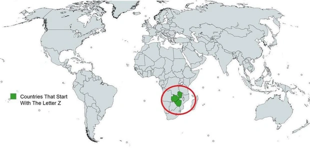 Сейчас в мире есть только две общепризнанные страны, русскоязычное название которых начинается на букву «З». В английском же (родном для создателей карты) это единственные страны, начинающиеся на «Z». И речь идет о соседних Зимбабве и Замбии. Ранее компанию в этом списке им составлял Заир, но с 1997 года эта страна носит название Демократическая Республика Конго.