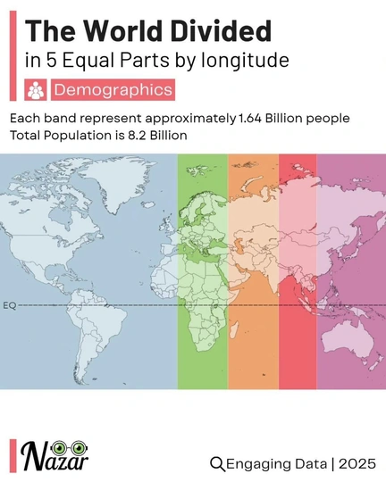 Сейчас население Земли составляет около 8,2 млрд человек. Авторы карты нашли способ поделить мир на пять частей с приблизительно равным населением: согласно их прикидкам, в каждой из полос проживает примерно по 1,64 млрд человек.