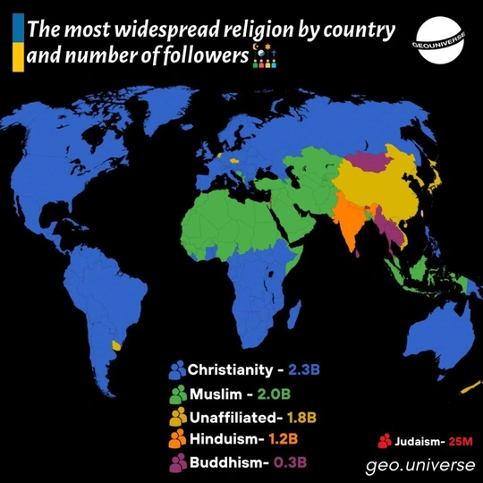 На карте показано, какая религия имеет наибольшее число последователей в каждой стране. Так, синим окрашены страны с преобладанием христиан, зеленым — мусульман, оранжевым — индуистов, фиолетовым — буддистов. Красный цвет отведен иудаизму, преобладающему только в Израиле, а желтым закрашены страны, в которых относительное большинство населения составляют люди, не исповедующие какую-либо религию.