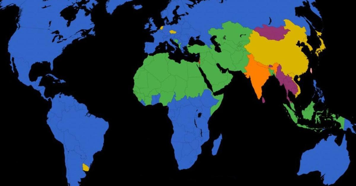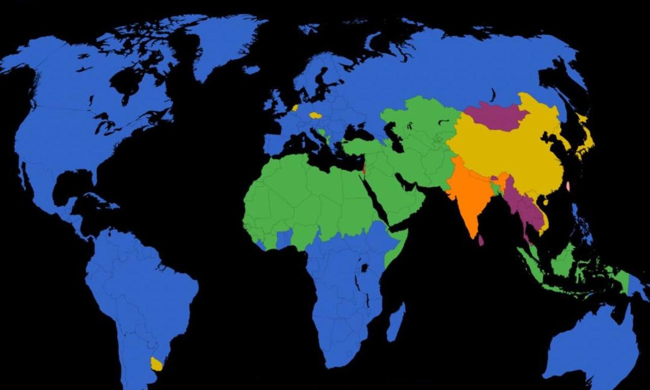 На представленной выше карте от проекта Geo.Universe страны мира окрашены в шесть цветов: синий, зеленый, желтый, оранжевый, фиолетовый и красный (чтобы найти его, нужно присмотреться, но он тоже представлен на карте). Каждый цвет свидетельствует о том, что в стране относительное большинство населения составляет определенная группа.