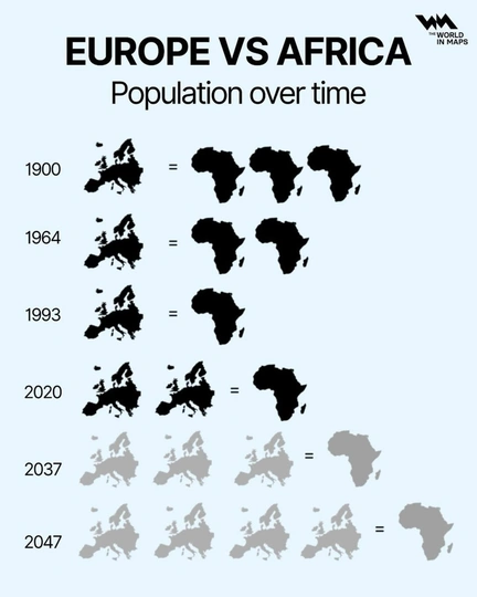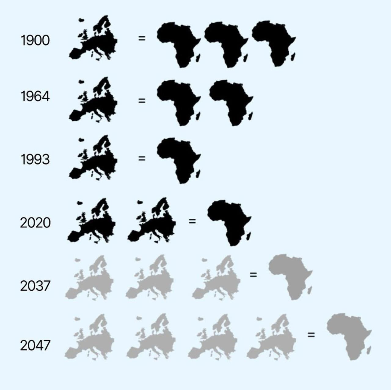 На инфографике показано, как менялось и будет меняться соотношение населения Европы и Африки. Если в начале XX века Европа превосходила Африку по населению втрое, а в 1964 году — вдвое, то в 1993-м по этому показателю был достигнут паритет, а в 2020-м уже Африка в два раза опережала Европу по населению. Предполагается, что к середине XXI века в африканских странах будет проживать вчетверо больше людей, чем в европейских.