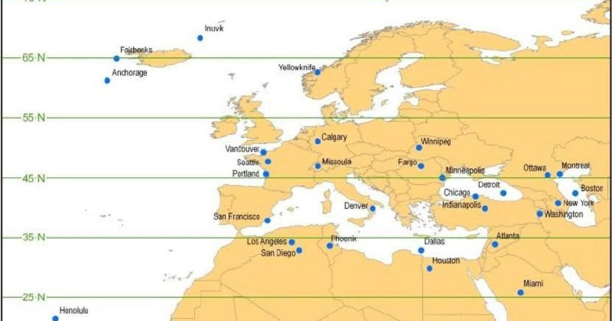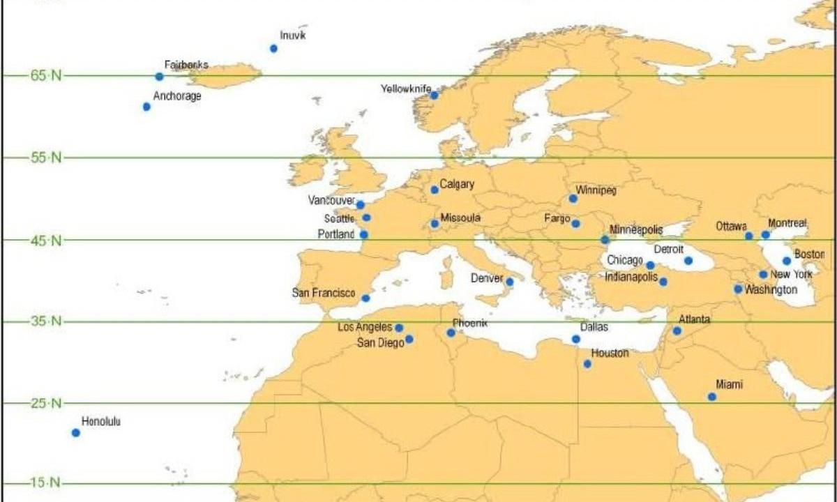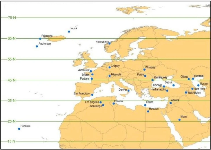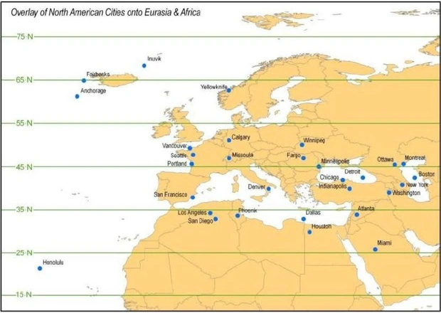Города США и Канады перенесены на карту Старого света с соблюдением их взаимного расположения, чтобы жителям европейских стран было проще оценить, как далеко на севере или на юге находится каждый из них — для этого на карте с шагом в десять градусов ярко выделены параллели — от 15-й до 75-й. Да и расстояния между многими городами Северной Америки на этой карте выглядят для европейцев нагляднее.