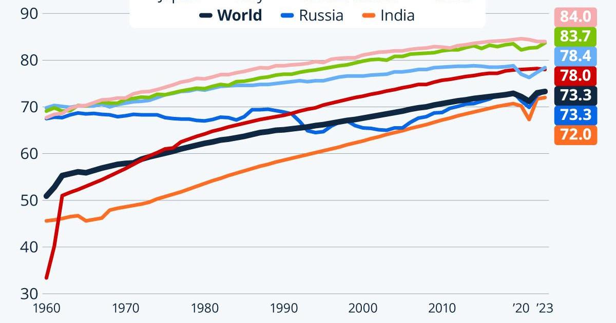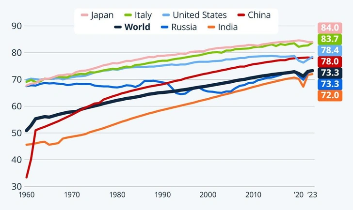 Стремительное развитие медицины в XX веке способствовало быстрому росту ОПЖ в мире. Во второй половине прошлого столетия темпы роста ожидаемой продолжительности жизни начали постепенно замедляться, но все равно оставались внушительными: если в 1960-м среднемировой показатель ОПЖ составлял около 51 года, до к 2023-му превысил 73 года, столько же ожидаемая продолжительность жизни составляла на тот момент и в России. В ряде развитых стран, включая приведенные на графике Японию и Италию, ОПЖ сейчас приближается к 85 годам, а в Китае и США — к 80 годам.