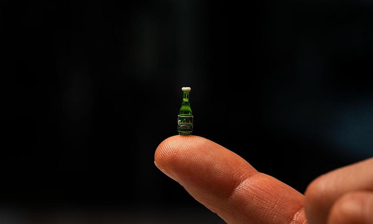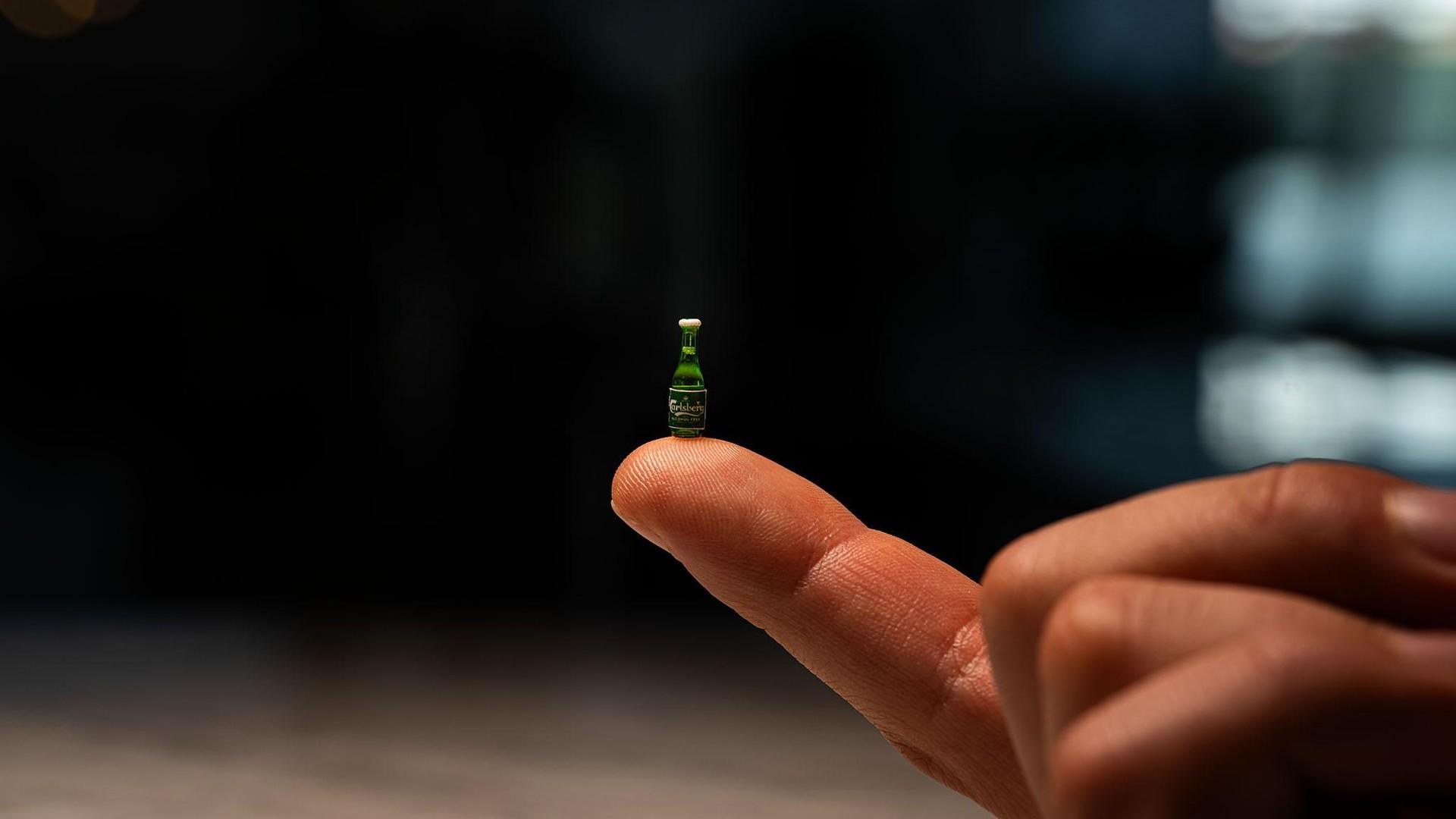 Высота бутылки, содержащей 0,05 миллилитра (примерно одну каплю) безалкогольного пива, составляет всего 12 миллиметров. При этом бутылка размером с рисовое зернышко выглядит совершенно так же, как обычная бутылка пива — на ней наклеена стандартная этикетка, и она снабжена герметичной крышкой.