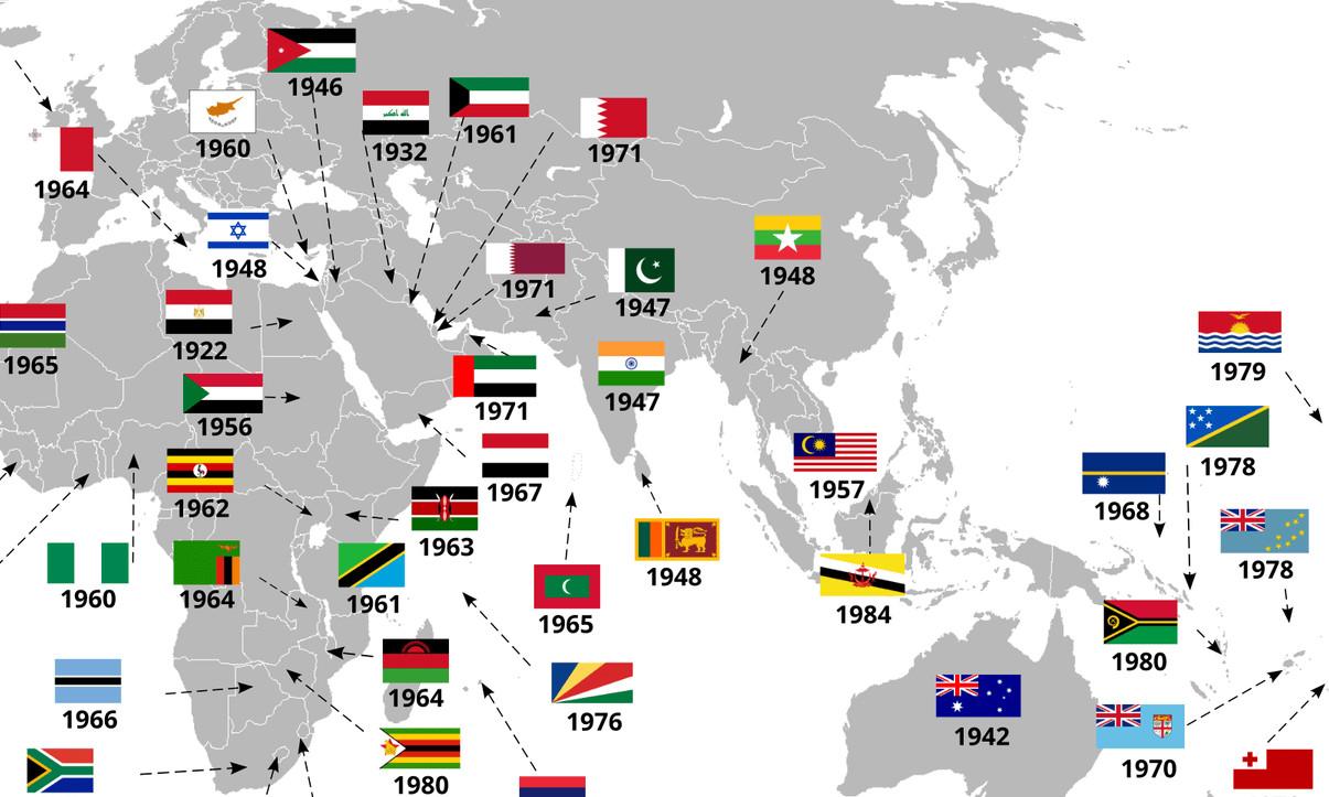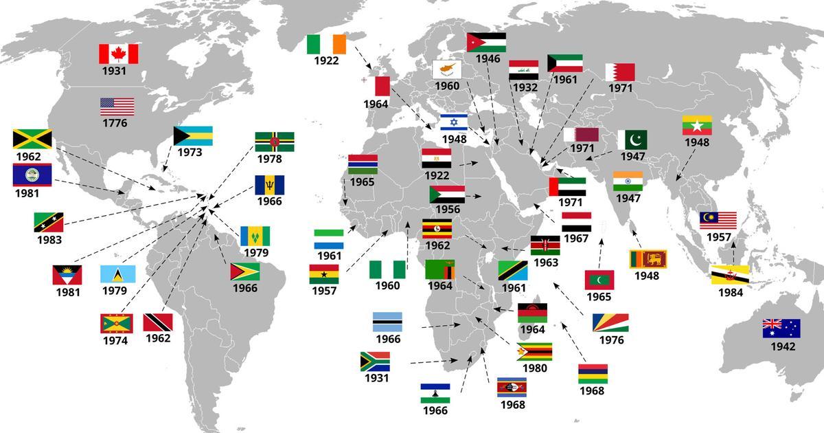 Составители карты отметили на ней страны, которыми ранее владела Британская империя, а также указали год обретения независимости этими государствами. Так, США отвоевали свою независимость в 1776 году, а вот все остальные отмеченные страны, включая Австралию, Новую Зеландию и Канаду, стали независимыми только в XX веке.