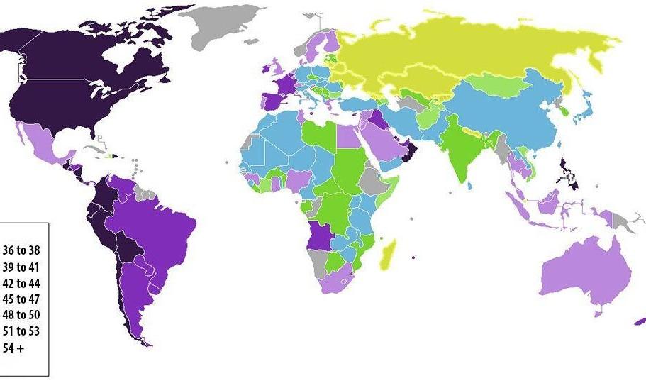 Перед вами карта мира, на которой скрыта определённая информация. Что именно на ней изображено — не сказано. Нужно внимательно посмотреть на распределение стран, оттенки и общую логику картинки, а затем попытаться догадаться, о чём идёт речь.