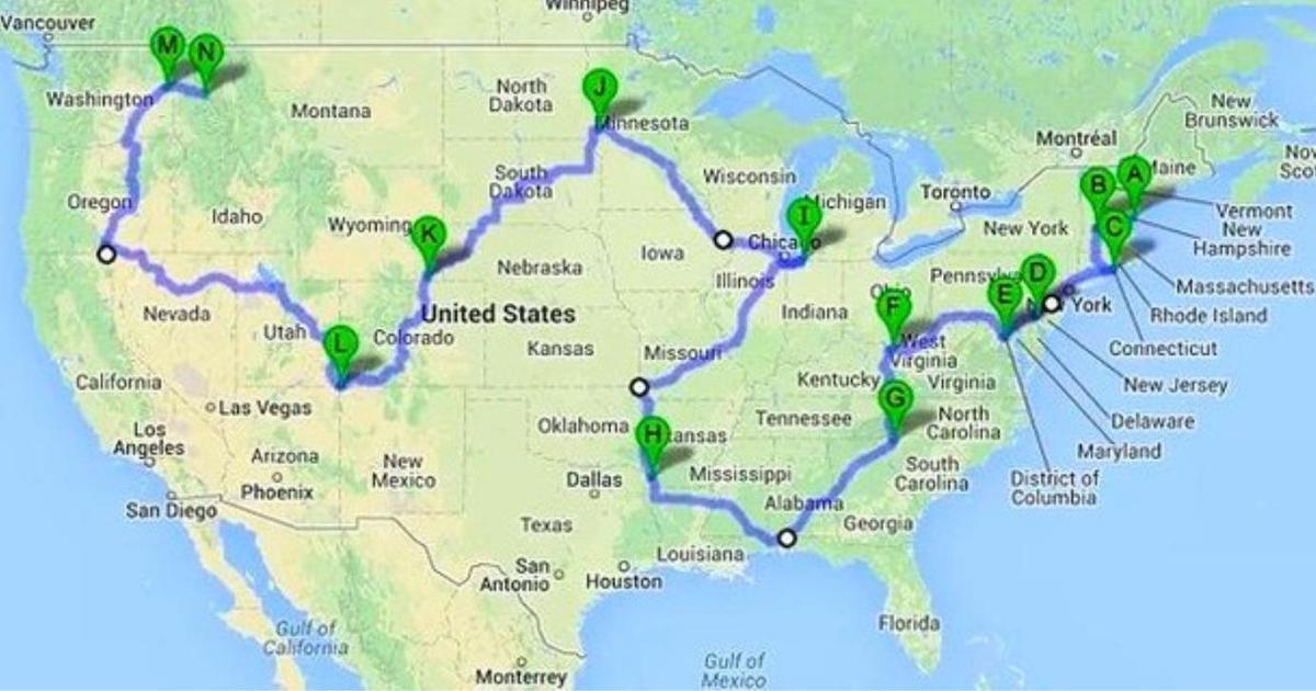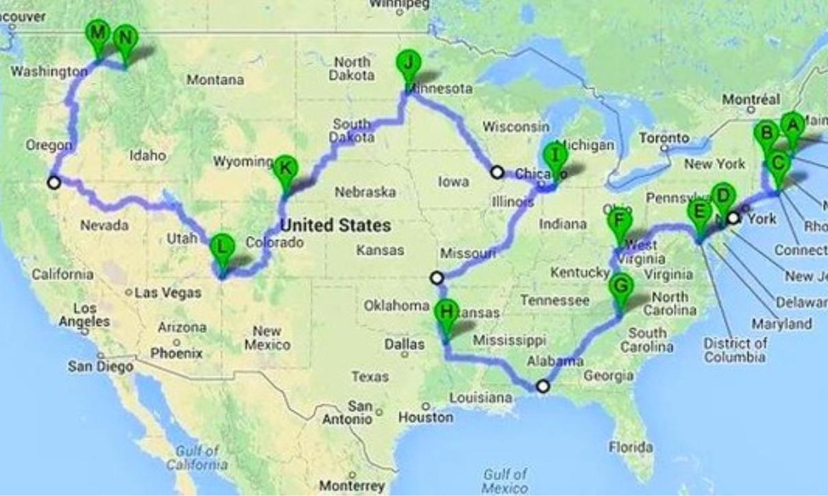 Проложенный с помощью компьютерного моделирования маршрут дает возможность за кратчайшее время побывать в каждом из штатов, исключая Аляску и Гавайи. Возможно, маршрут не является идеальным для достижения этой цели, но близок к таковому, а по пути при этом оказываются некоторые известные американские достопримечательности.