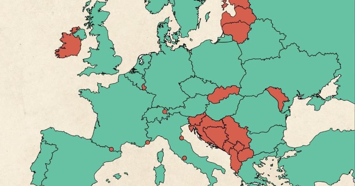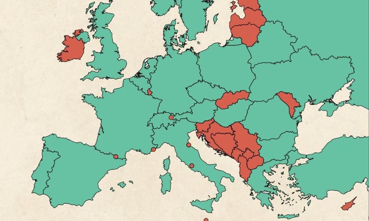 На представленной выше карте Европы от проекта The World in Maps указано наличие (зеленым) или отсутствие (красным) в каждой из стран хотя бы одного объекта некоторого типа.