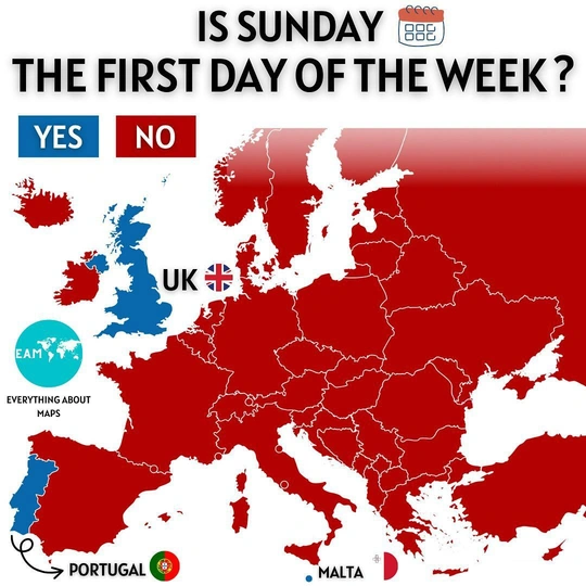 Красным на карте отмечены страны, в которых понедельник является первым днем недели. Однако на Мальте, а также в Португалии и Великобритании таковым в силу исторических и религиозных традиций по-прежнему формально считается воскресенье, что зачастую отражено в календарях. При этом во всех трех странах понедельник остается первым рабочим днем недели, а воскресенье — выходным.