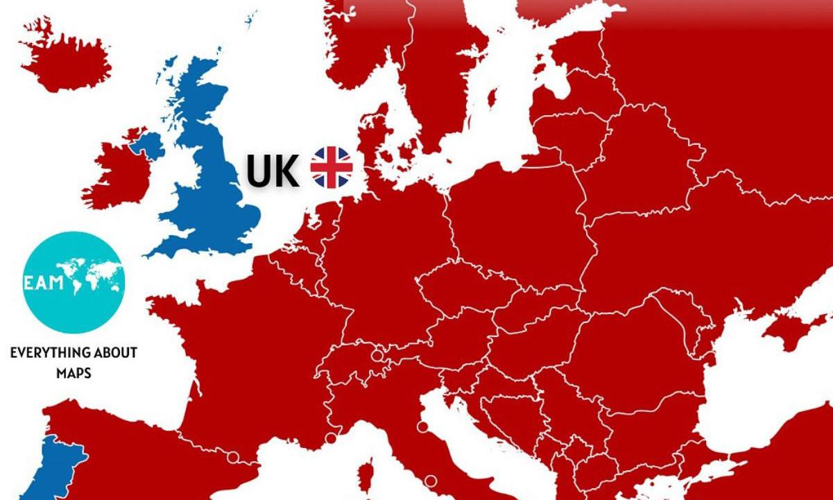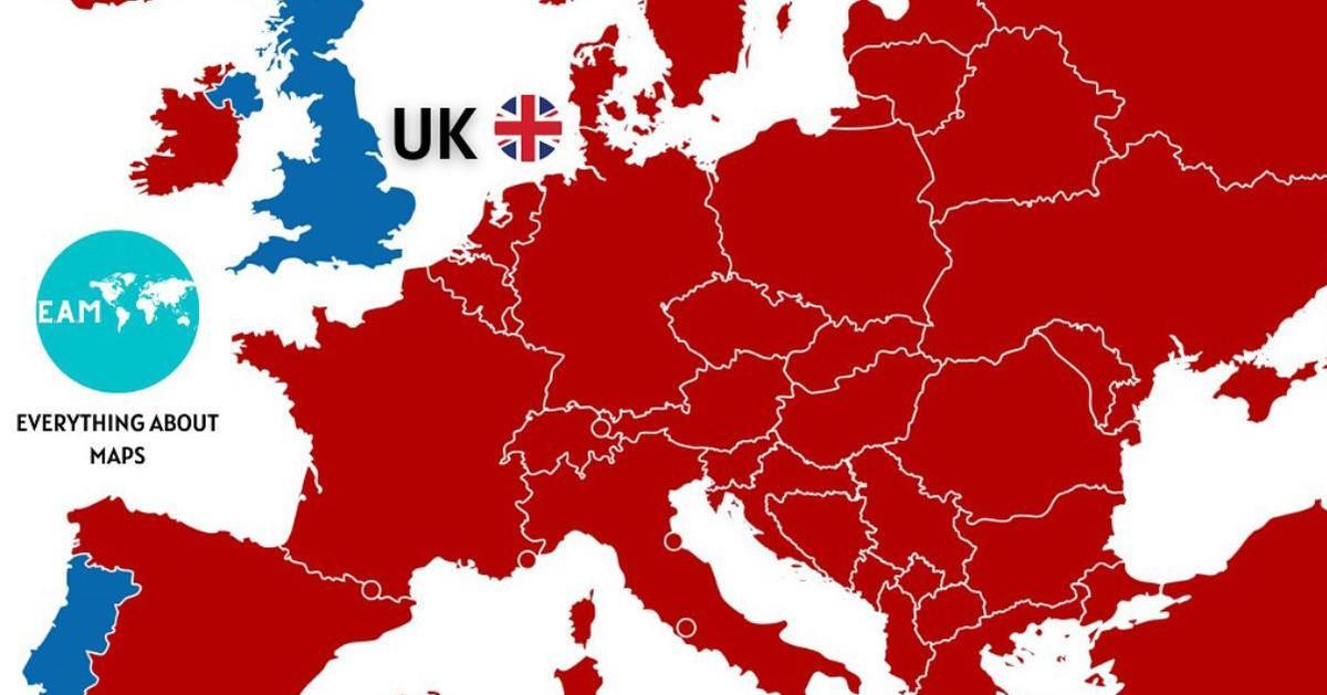 Посмотрите на инфографику выше, подготовленную проектом Everything About Maps. Нетрудно заметить, что территория почти всех стран на этой карте Европы закрашена красным цветом. Исключение составляют лишь выделенные синим Великобритания, Португалия и Мальта.
