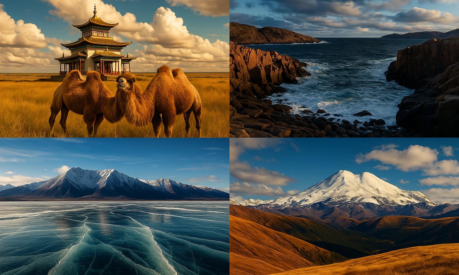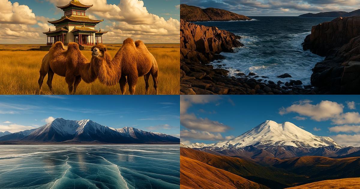 Россия — огромная и удивительная страна, и у каждого ее региона свой характер и пейзаж. Где-то вулканы дымятся над ледниками, где-то старинные церкви отражаются в озерах, а где-то среди степей встречаются верблюды…