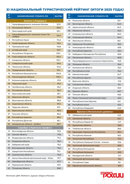 Полностью XI Национальный туристический рейтинг 2025 года в России выглядит вот так.