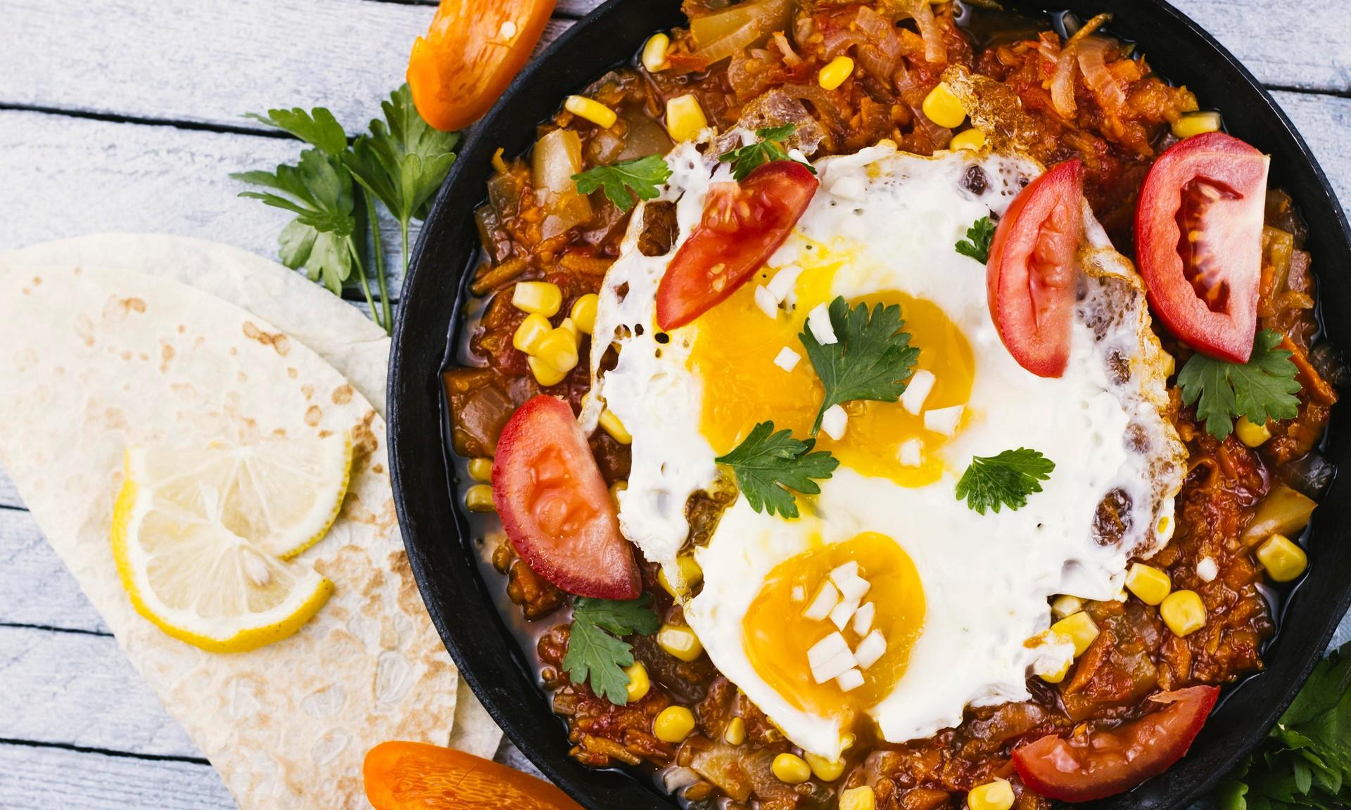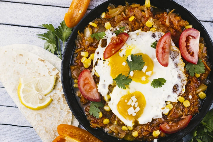 Израильская шакшука с салатом, хумусом и питой