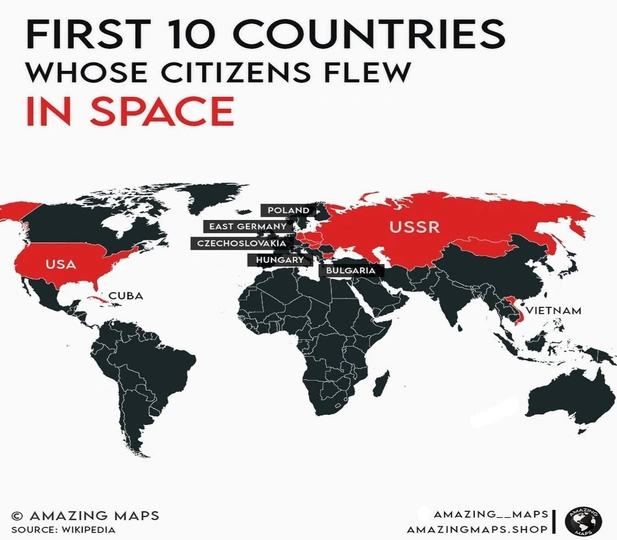 Речь идет о странах, граждане которых первыми побывали в космосе. Пальма первенства здесь, разумеется, принадлежит СССР: Юрий Гагарин совершил свой исторический полет 12 апреля 1961 года. Меньше чем через месяц в космосе побывал американский астронавт Алан Шепард. Пополняться этот список продолжил только через 17 лет, когда Советский Союз начал активно отправлять в космос на кораблях «Союз» представителей дружественных стран в рамках программы «Интеркосмос».