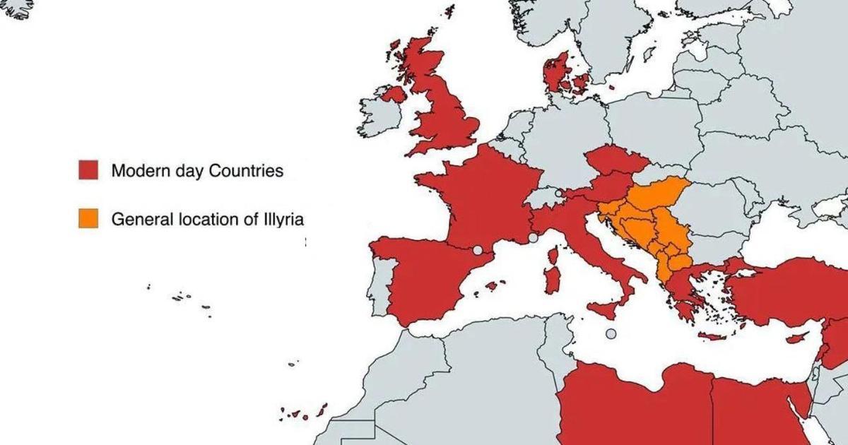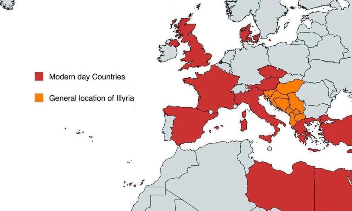 На карте выше по определенному принципу отмечены более десятка государств Европы, Азии и Африки в их современных границах (красным цветом), а также историческая область Иллирия, охватывающая в основном западную часть Балканского полуострова.