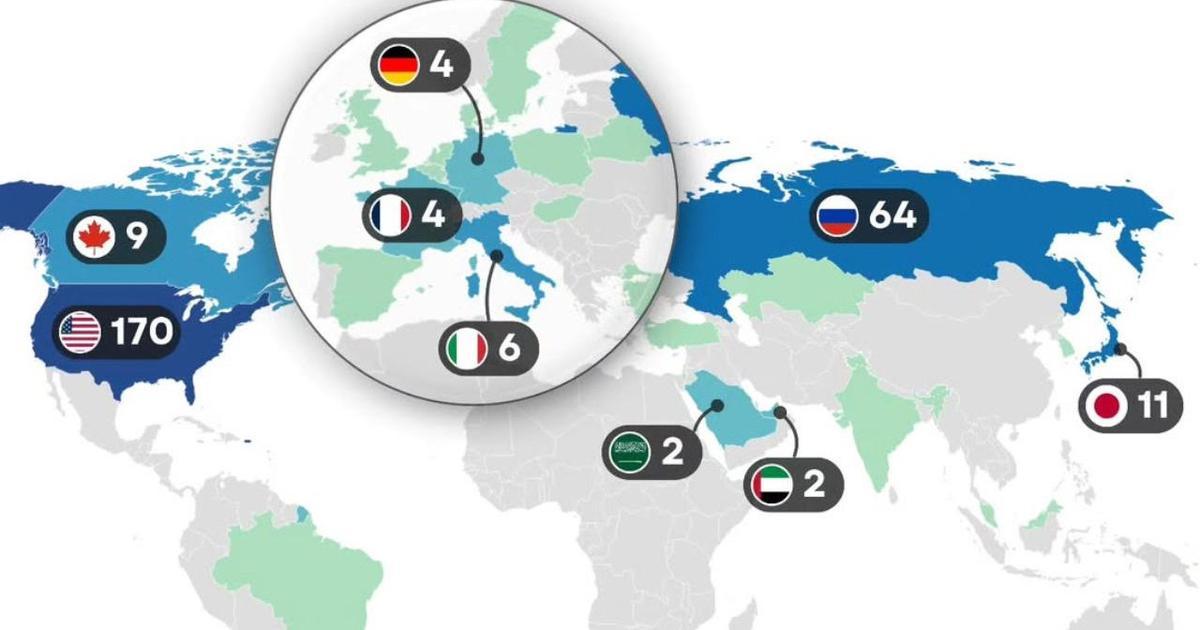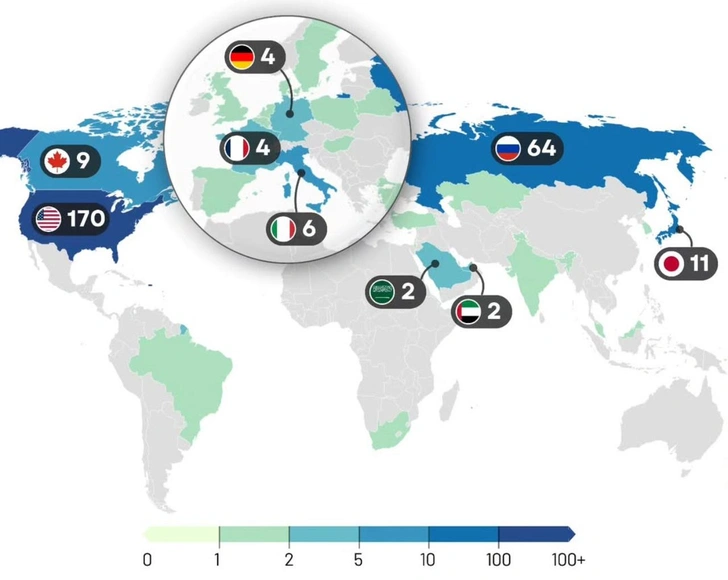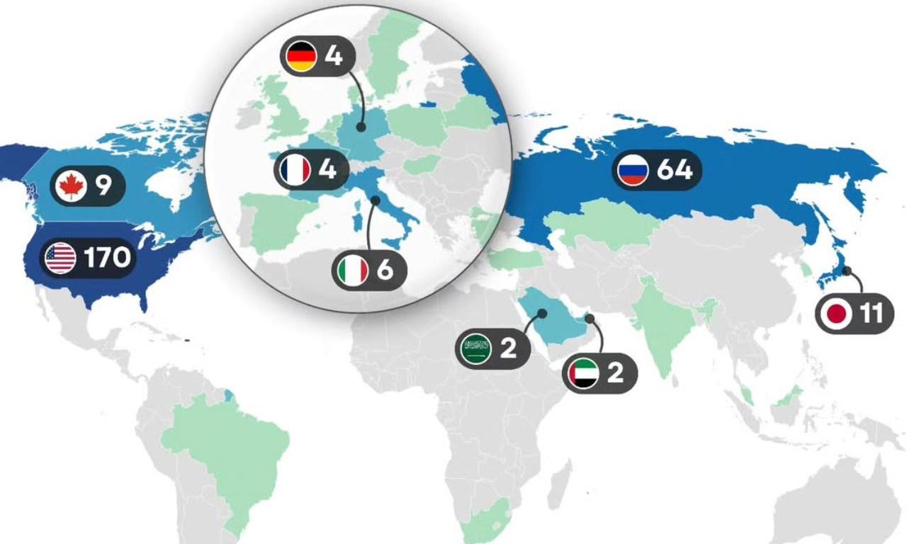 На представленной выше карте, подготовленной проектом Nazar Data, разными цветами выделены страны, граждане которых в XXI веке совершили некое путешествие, причем некоторые — не единожды. В США таких людей сегодня насчитывается 170, в России — 64, а в замыкающей тройку лидеров Японии — 11.