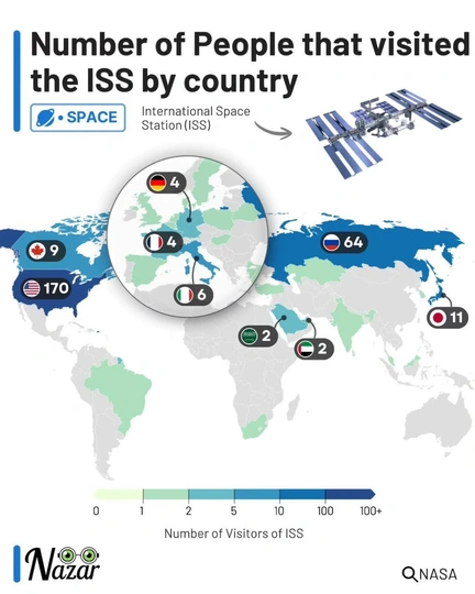 На карте отмечены страны, граждане которых летали на Международную космическую станцию (МКС). Лидерами здесь с большим отрывом ожидаемо являются США (170) и Россия (64). Далее идут представители Японии (11) и Канады (9), участвующих в проекте МКС, а также граждане Италии (6), Франции (4) и Германии (4), поскольку пятым участником проекта является Европейское космическое агентство (ESA).