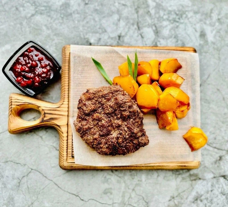 Блюдо, которое готовит шеф-повар ресторана «Беломорский» Наталья Косцива, представляет собой сочный рубленый биток из дичи в сочетании с овощным гарниром сладко-соленого профиля. Технология приготовления обеспечивает сохранение нежной структуры оленины.