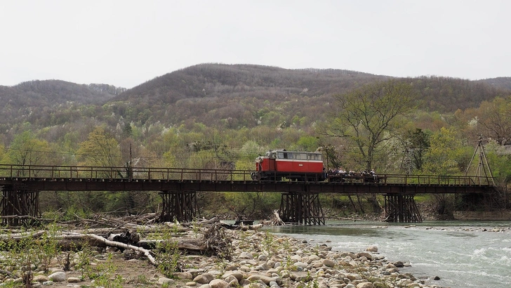 Но для второго по пути ущелья сделано исключение: здесь и правда захватывает дух не хуже, чем у первых Волчьих Ворот. К тому же путь пересекает пропасть по старинному клепаному мосту — в народе его зовут «немецким», так как его восстанавливали после войны пленные немцы. Насколько же деликатно здесь проложена узкоколейка! Пути крадутся по краешку склона, все бочочком, прижимаясь к скале или пробираясь сквозь кроны деревьев. И только там, где без усилия воли не обойтись, появляется на свет красавец-мост.