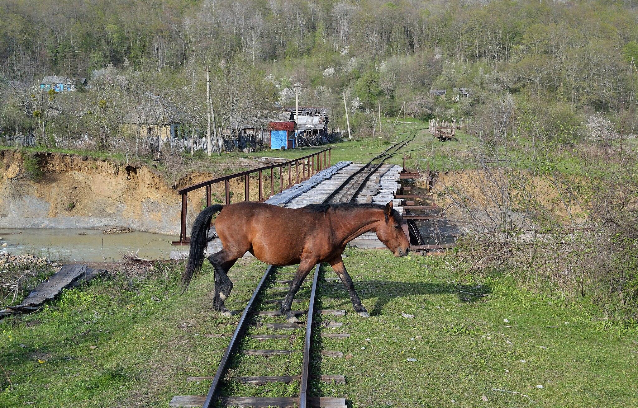 За станцией начинается крутой поворот, выводящий к первому железнодорожному мосту через Пшеху. Для раскиданного по обоим берегам поселка с несколькими десятками дворов этот мост исполняет роль и связующей нити, и местной доминанты. Проходя по деревянному настилу над широким каменистым руслом, то и дело замираешь перед животрепещущей картиной: бурная и стерильно прозрачная на вид вода неустанно наваливается на вечно мешающиеся валуны, как будто стыдливо покрытые мхом.