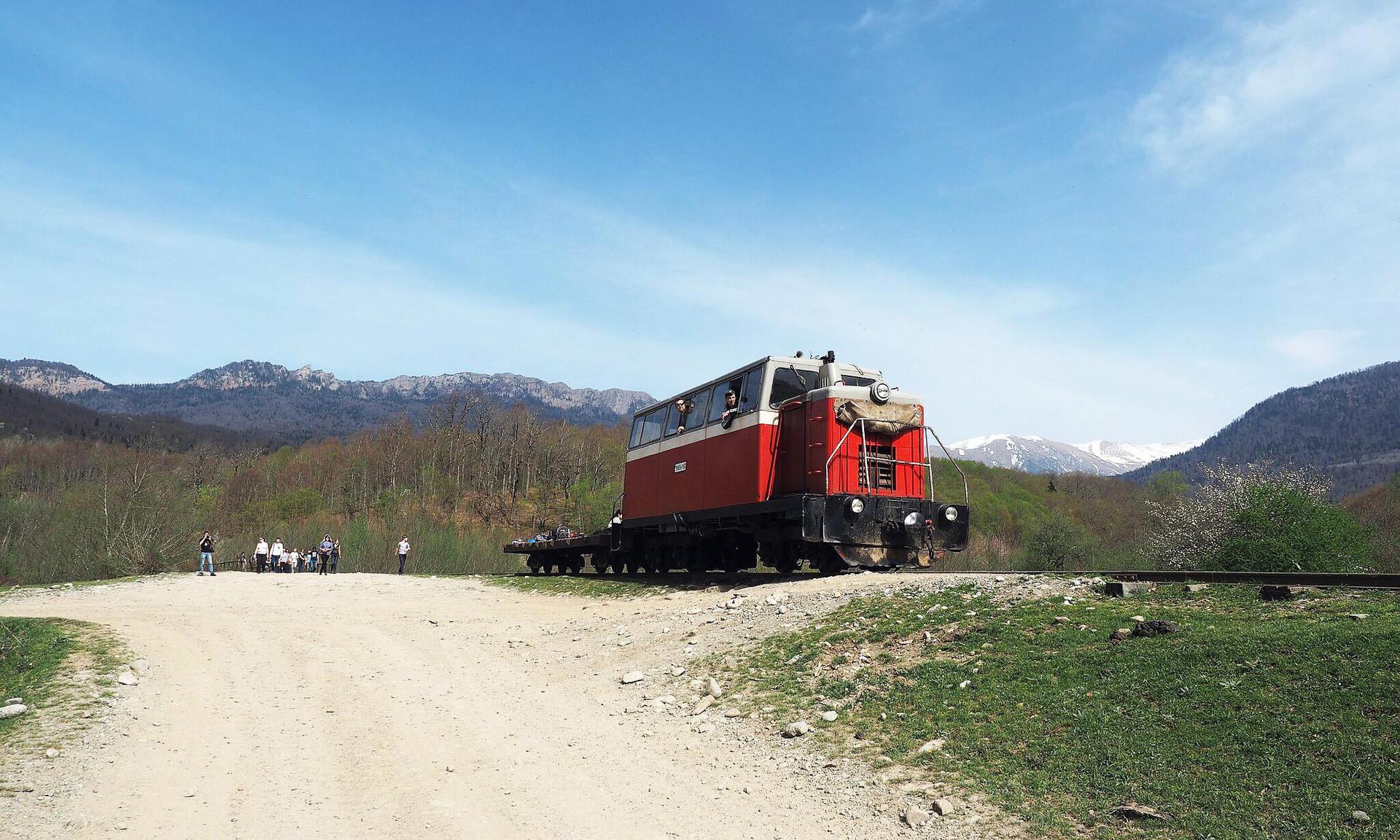 Главный поезд Апшеронской узкоколейки, он же «матрица» (от слова «мотриса»), готовится к отправлению из поселка Черниговское Краснодарского края, за которым относительно равнинная местность переходит в по-настоящему гористый ландшафт.