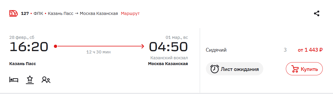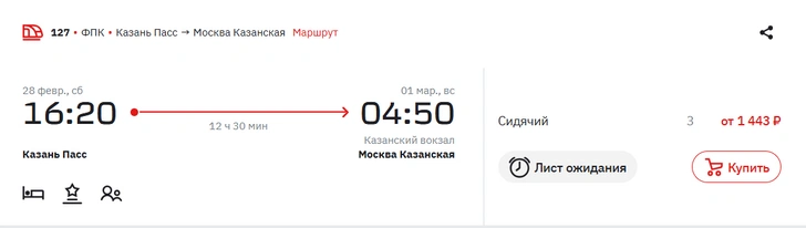 * По всей видимости, имеются в виду вагоны с местами для сидения, которые есть в некоторых поездах, курсирующих между Москвой и Казанью. Купившим билеты на такие места придется провести в сидячем положении от 11 до 13 с лишним часов. Билеты стоят от 1440 рублей на даты в конце февраля.