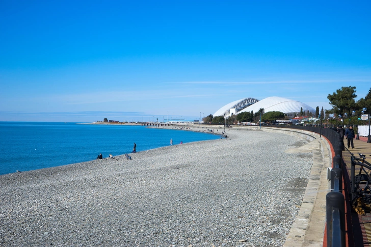 Полюбоваться морем в Сочи получится на пешей или велосипедной прогулке по Имеретинской набережной. Олимпийский парк, расположенный неподалеку, открыт круглый год.