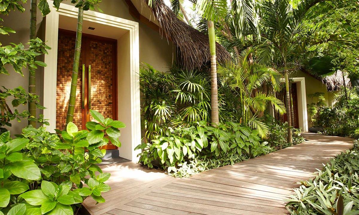 Отель, по сути, расположен внутри ботанического сада, за которым нон-стоп ухаживают восемь садовников. Идя к завтраку, встречаешь этих смуглых мужчин то за обрезанием листьев, то за стрижкой травы, то за подметанием дорожек от упавших цветков гибискуса. Эти цветы, бежевые и розово-красные, любят таскать птички-пастушки (они же белогрудые погоныши), а традиционно на Мальдивах из них плетут ожерелья.