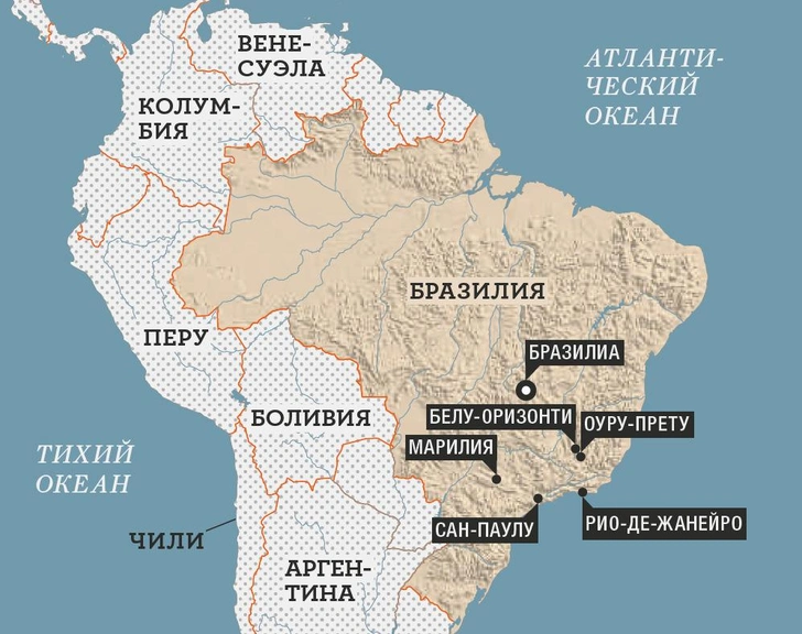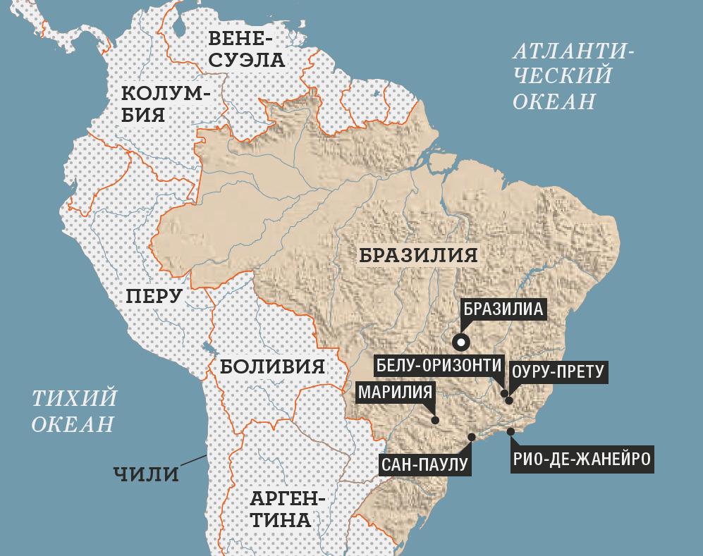Когда-то в Оуру-Прету, исторической столице штата Минас-Жерайс, добывали золото. Оно было с примесью оксида железа, что и дало название городу — «черное золото». В XVIII веке это был мегаполис с 80 тысячами жителей — вдвое больше, чем в Нью-Йорке. С тех пор население не выросло. Город переполнен туристами, но практически все они бразильцы. Экскурсию по заброшенной золотой шахте могут провести и на английском, правда, гид не знает этого языка — английский текст он просто заучил наизусть.