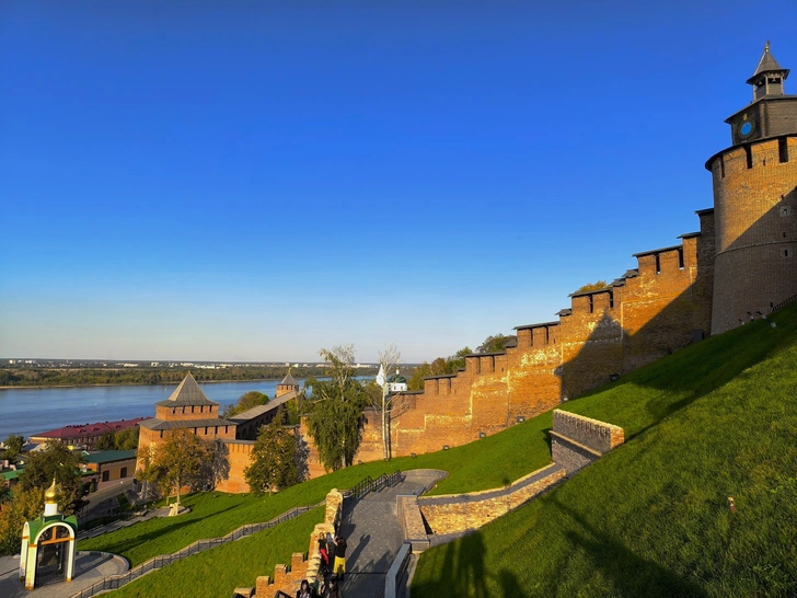 В мае 2025-го после модернизации заработала канатная дорога через Волгу. Поэтому, погуляв по Кремлю, по Рождественской и Большой Покровской улицам движемся в сторону канатки. Прокатиться в одну сторону стоит 150 рублей, взять билет сразу туда и обратно нельзя — любителей кататься по кругу так много, что местные жители не могут попасть на другой берег. Кстати, из кабинки канатной дороги можно в полной мере насладиться удивительными красками нижегородского заката.