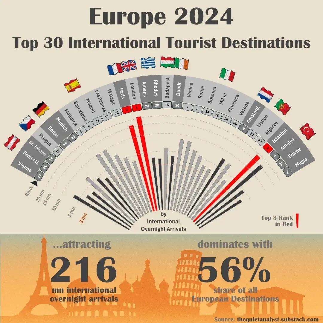Международный туризм уже несколько лет сохраняет уверенный рост — его масштабы давно превысили доковидные показатели. При этом существенную часть туристических поездок составляют путешествия по Европе. О том, какие европейские города чаще всего посещали туристы в 2024 году, можно узнать из инфографики, подготовленной пользователем портала Voronoi App под ником thequietanalyst.
