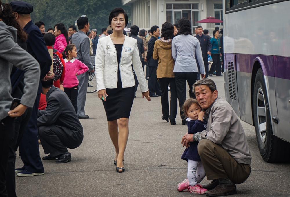 Пхеньян похож на декорации к фильму. Кристально чистые улицы, где очень немноголюдно. Все одеты с иголочки — мужчины в строгих деловых костюмах: черный низ, белый верх. Женщины в строгих блузках и длинных чёрных юбках. И у всех на воротнике значки с глубокоуважаемыми вождями — Ким Ир Сеном и Ким Чен Иром, неотъемлемый атрибут северокорейского гардероба.