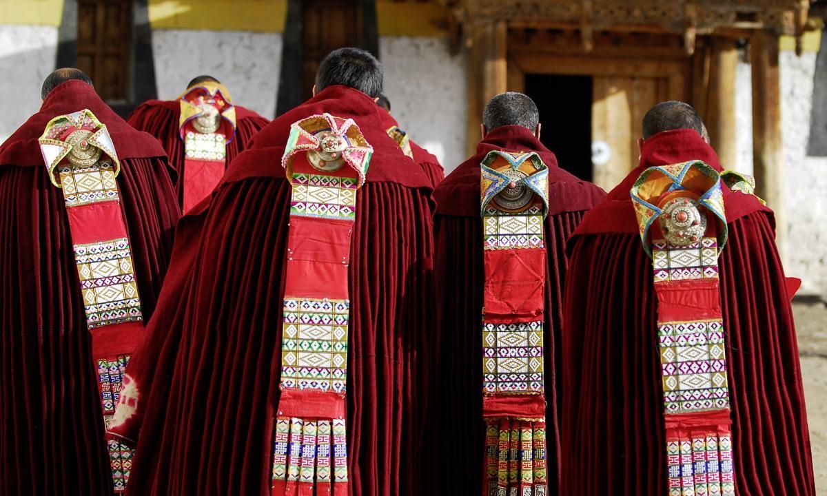 На выставку с ней приехал ее начальник — глава больницы и доктор тибетской медицины. По совместительству он еще и монах, поэтому всегда одевается одинаково: в бордовую шерстяную юбку, которая символизирует отречение от мирской жизни, пиджак и дхенг — темно-красную накидку.