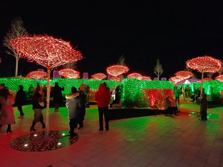 Пространство продумано так, чтобы работать круглый год — и летом, и зимой парк остается живым. В новогодние праздники пространство и вовсе становится сказочным благодаря масштабной иллюминации.