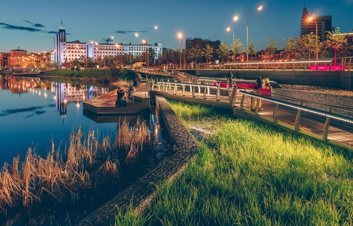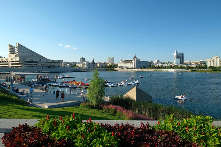 Рядом находится новый Татарский государственный академический театр имени Галиаскара Камала. Это усиливает культурную роль территории и вписывает ее в вечерние сценарии времяпровождения. Коммерческих объектов здесь немного. Пространство оставили максимально открытым и свободным — это осознанное решение, чтобы сохранить ощущение природы в центре города.