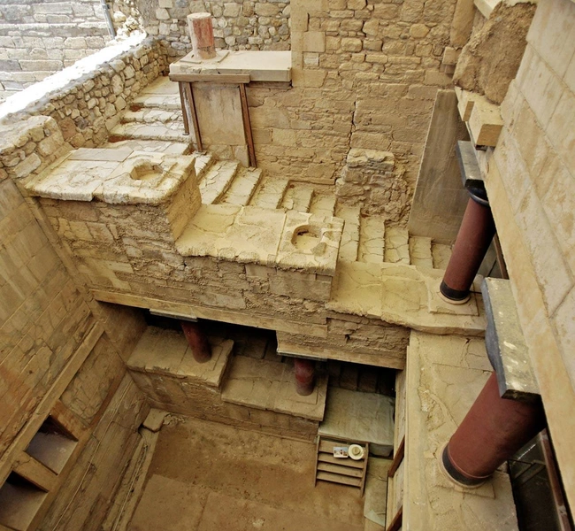 Однако если разобраться, реальный Кносс не кажется таким уж запутанным: большинство общественных помещений группируются вокруг просторного центрального двора, мастерские расположены в северо-восточной части, а личные покои правителей занимают укромный блок в юго-восточной. Больше всего помещений отдано под хранилища.
