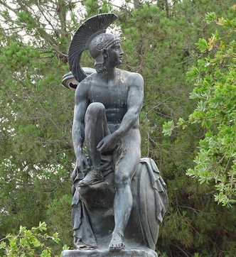 Впрочем, Саша хочет показать вовсе не барахолку. Он предлагает обратить внимание за спины продавцов: в центре небольшой площади мраморный постамент, а на нем… «Это он, твой герой», — говорит Саша. Бронзовый Тесей сидит, завязывая сандалию, будто отдыхает после подвига.