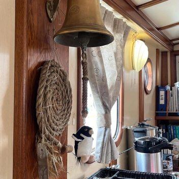 Эпицентром нашей жизни на судне стала кают-компания — просторное помещение, где мы собирались, чтобы поесть, посмотреть фильмы, послушать лекции или просто пообщаться. Поскольку судно было учебным, для всех гостей подготовили график вахт.