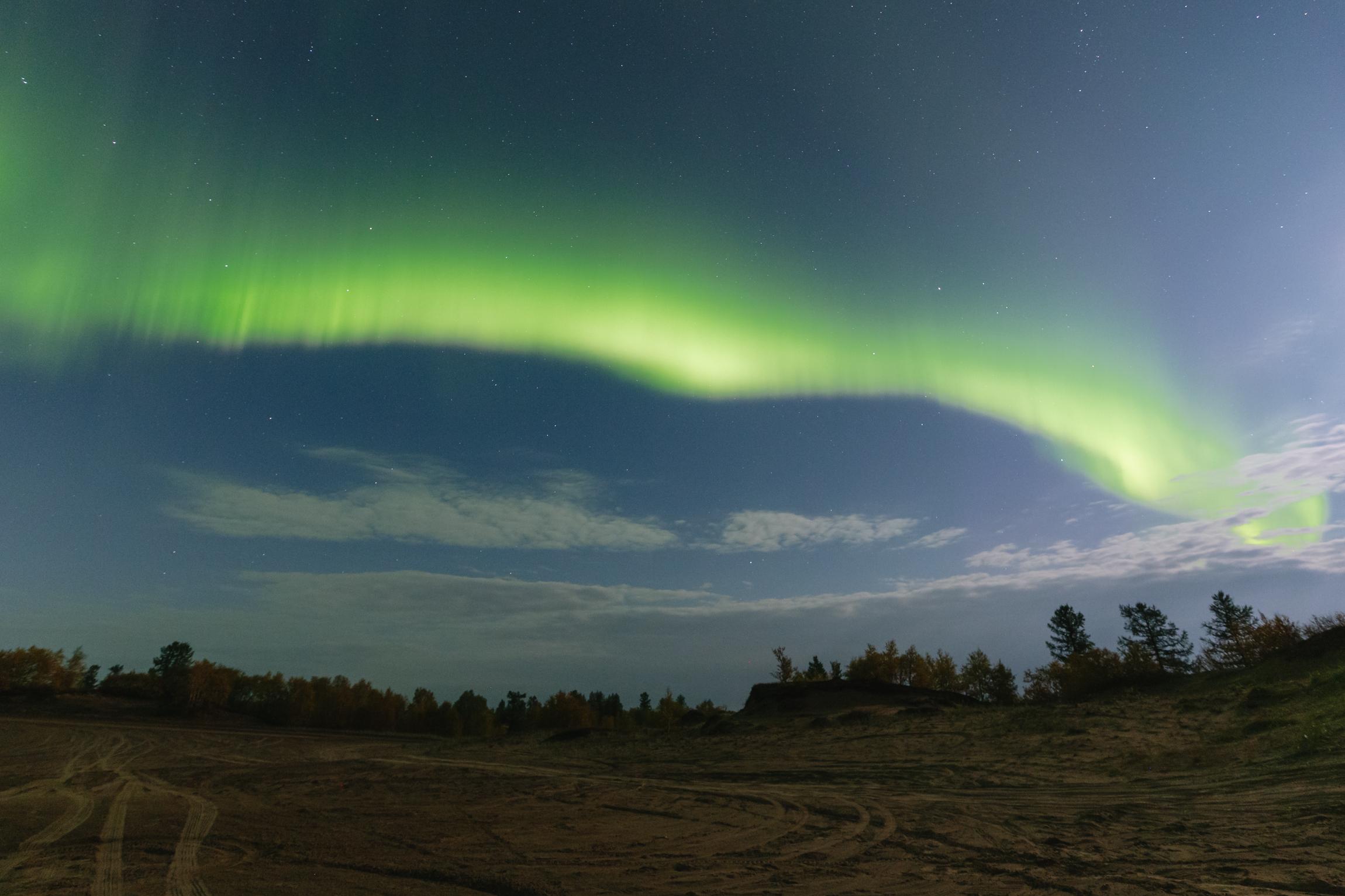 Конечно, сияние сиянию рознь — в иные дни даже разглядеть его получится не сразу, тогда как при удачном стечении обстоятельств оно бывает очень ярким. Нам, как новичкам, везет — прогноз не обещает почти ничего, но затем в небе появляется и разгорается зеленая дуга, даже яркая Луна не мешает любоваться колышущимся свечением.