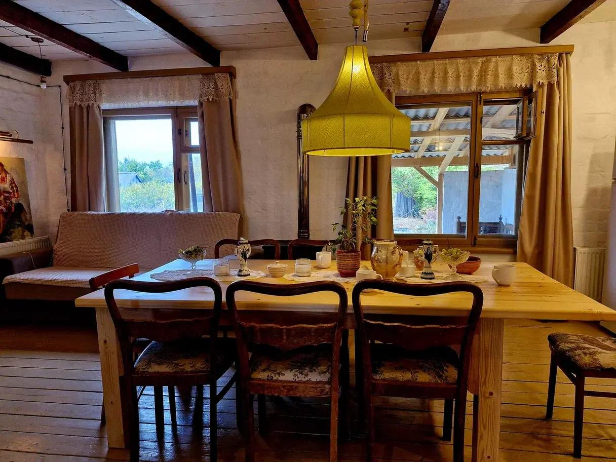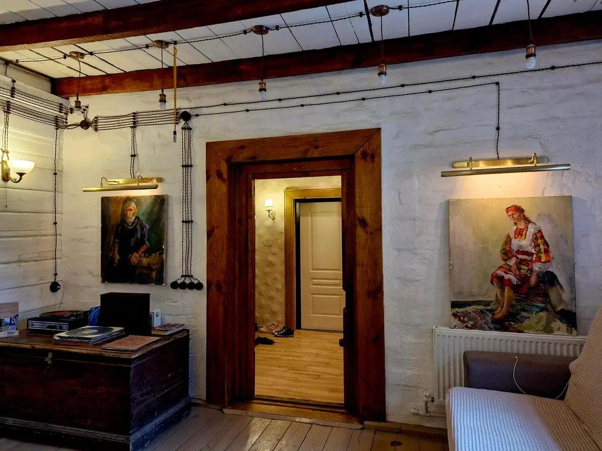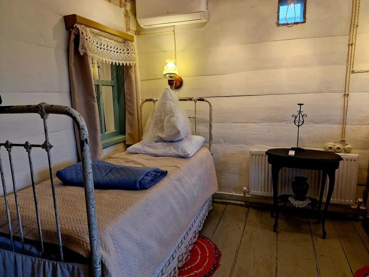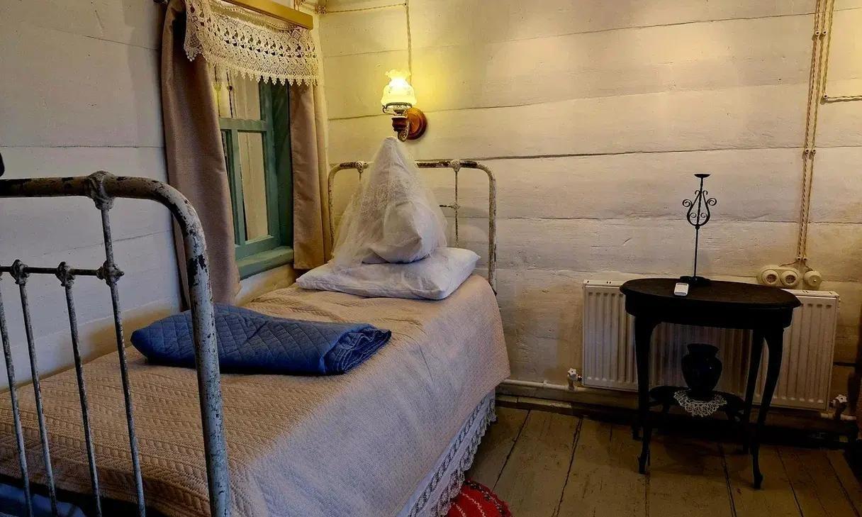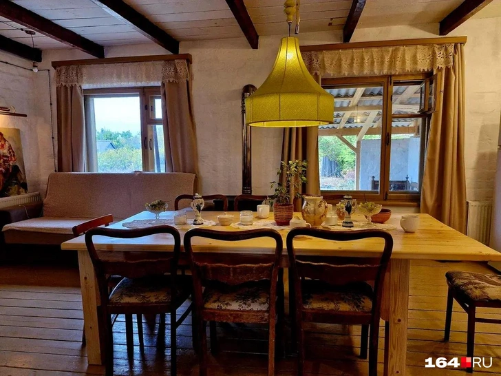 В «избушке на новый лад» переплелись несколько эпох. Здесь вам и старинные кровати с накидками, и иконы, и сундуки, и советский проигрыватель пластинок, и современный камин с нагревательной колонкой.