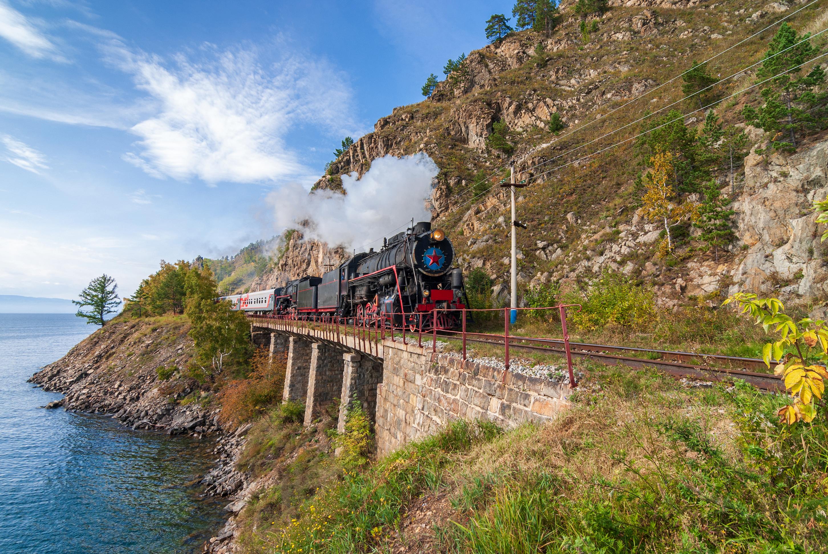Пожалуй, одним из самых красивых и необычных железнодорожных маршрутов России можно назвать Кругобайкальскую железную дорогу (КБЖД), проложенную вдоль побережья Байкала, среди обрывистых скал.