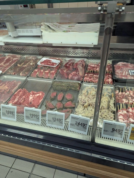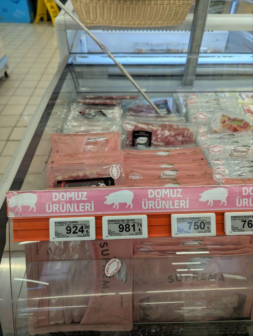 Мясо, как я уже и сказала, стоит запредельно дорого. Даже с таким курсом. Ладно свинина — турки ее не едят, так что это, конечно, редкость в здешних магазинах. Впрочем, челюсть все равно отваливается, когда видишь упаковочку свинины за 1500 руб. и дороже.