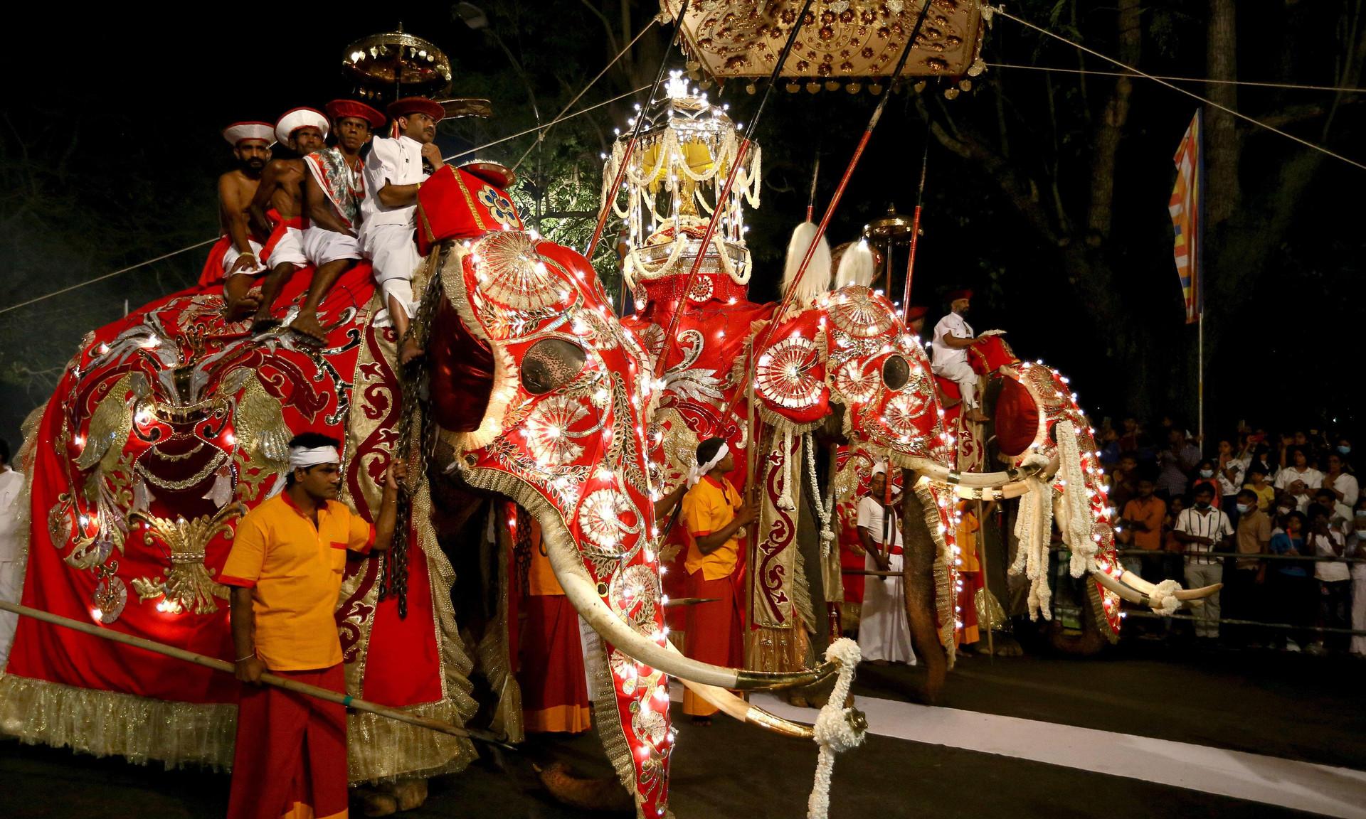Наконец выступают слоны — увешанные горящими разноцветными лампочками, в расшитых золотыми нитками попонах, с серебряными наконечниками на клыках. На спине первого везут свиток из листьев талипотовой пальмы, где перечислены все победы и подвиги кандийских правителей. На втором восседает главный махаут (начальник царских сановников), держа в руках символ власти — серебряный багор. Шествие перемежается танцами в разных стилях.
